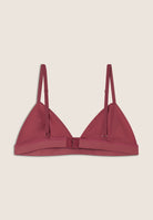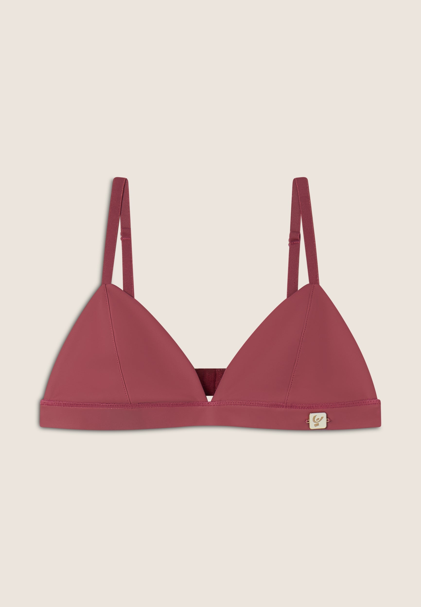 A bra top with an unmistakable shine, made from laminated-effect faux leather with recycled polyester fibres. The design with thin adjustable straps, triangle cups and central seam offers light support and a bold style. The rear hook-and-eye fastener completes the design with practicality.