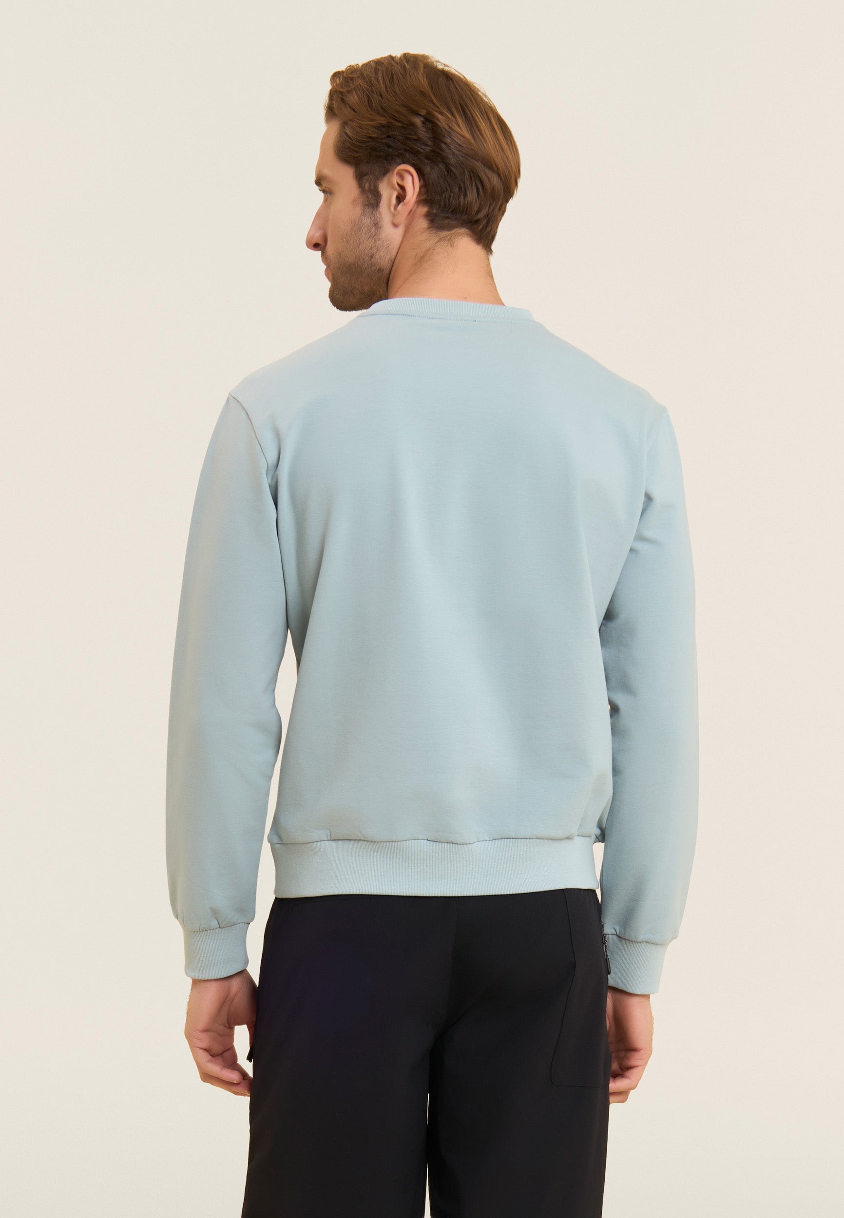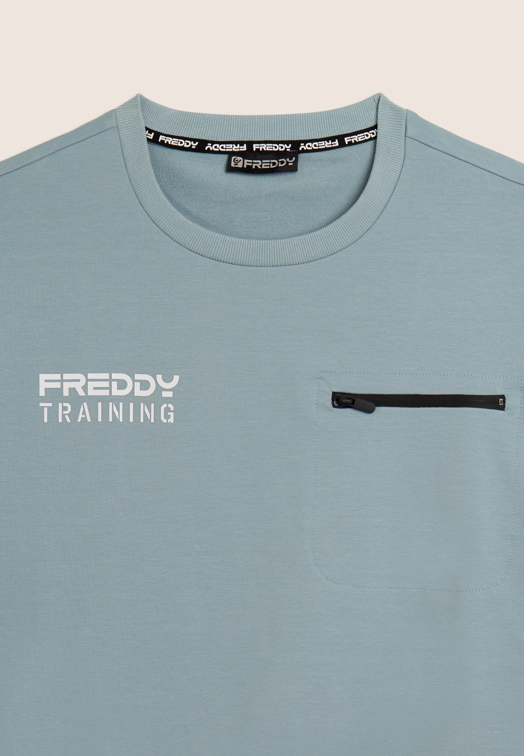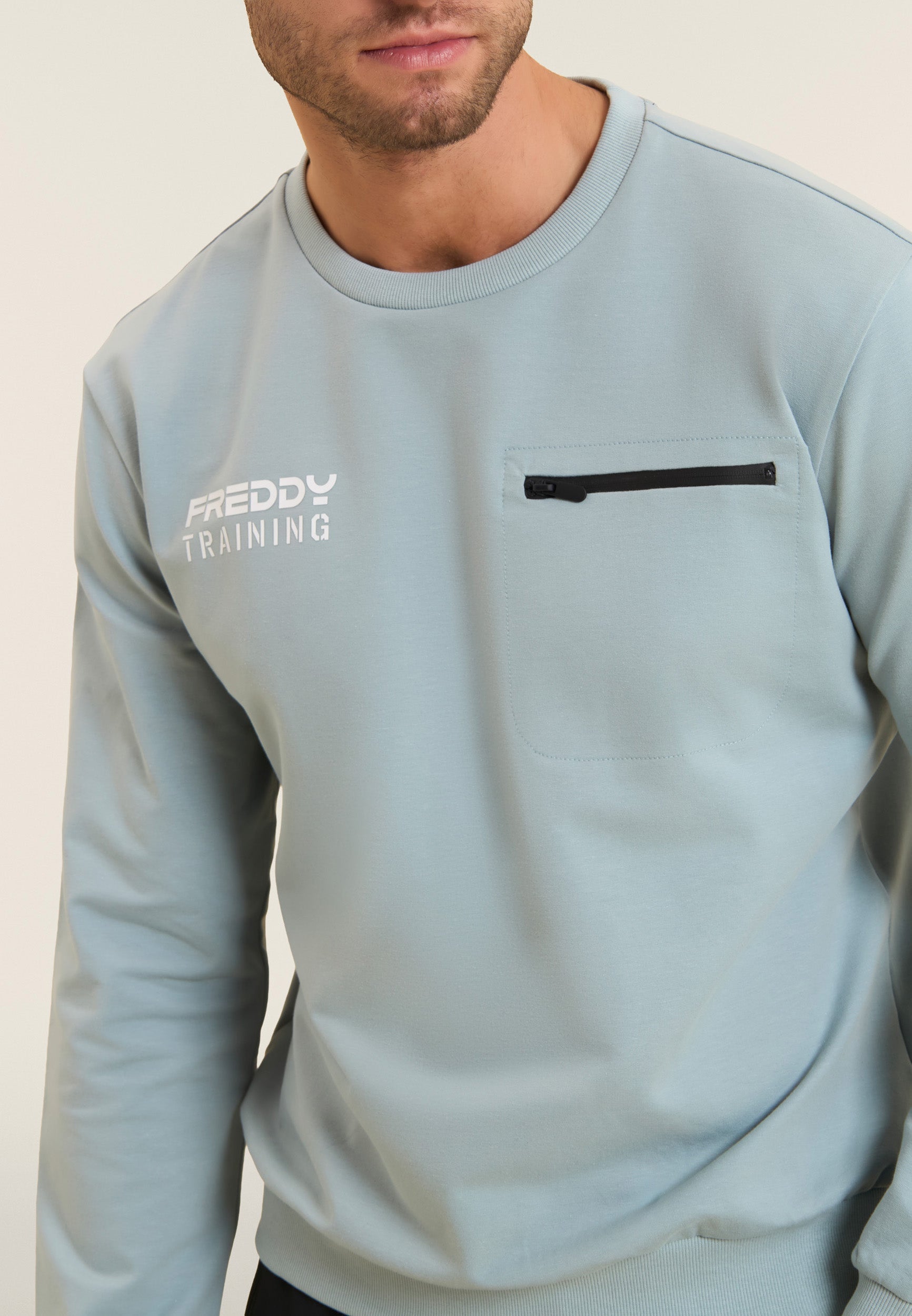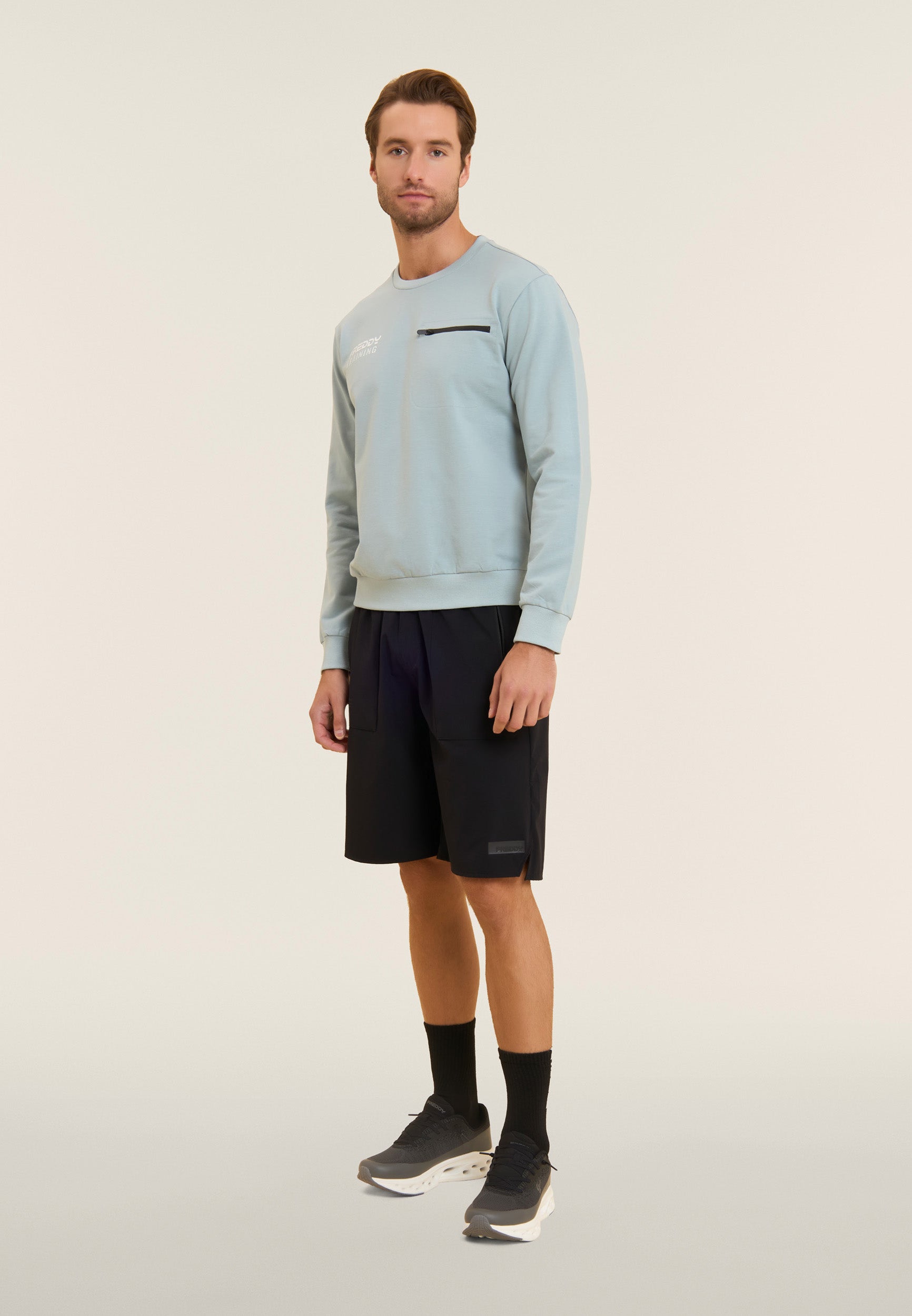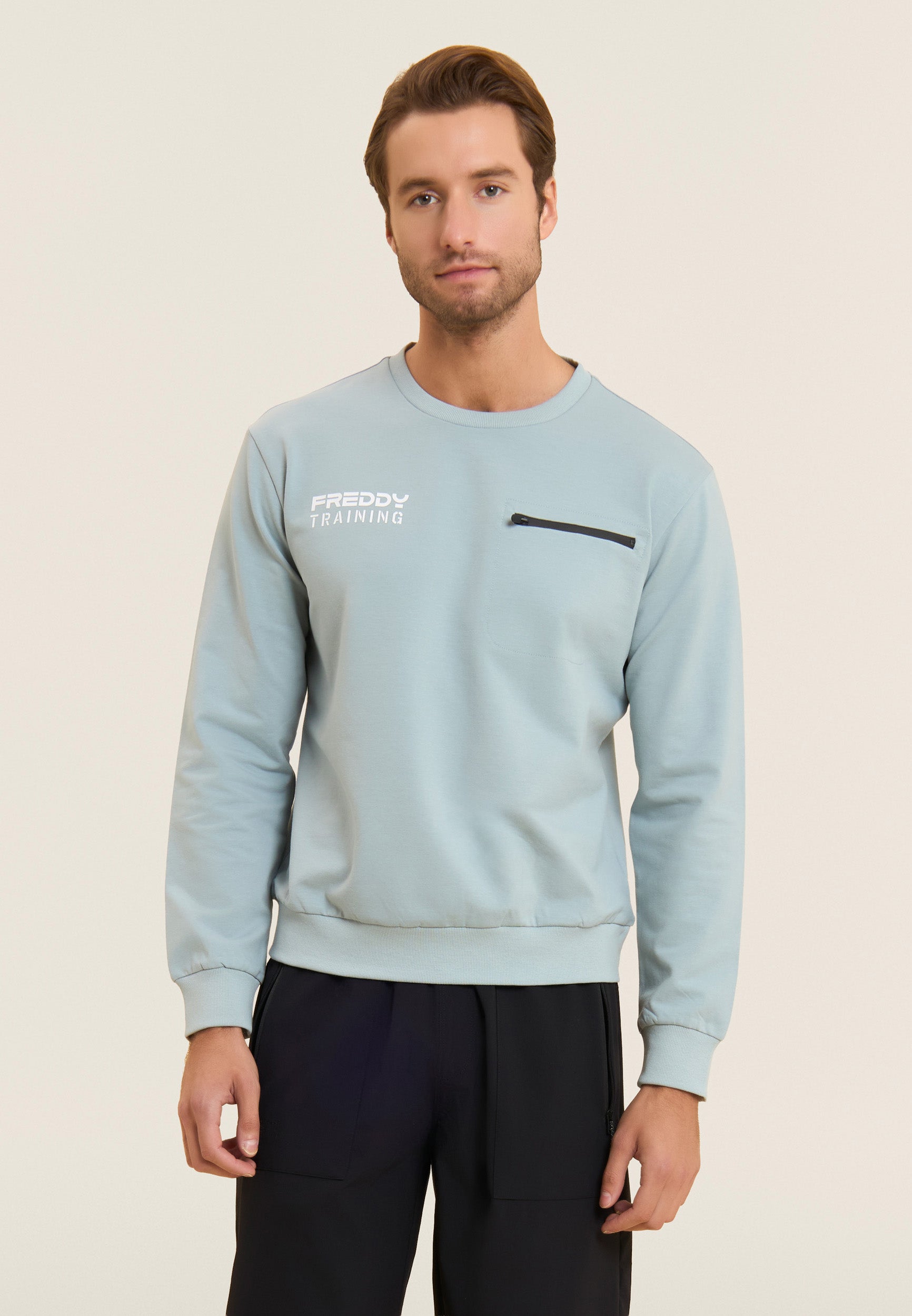Men's sweatshirt with crew neck, regular fit and regular length, perfect for everyday use and light training. The structure includes a hem band and ribbed cuffs for a comfortable fit. The applied heart-side zipped pocket is enriched by the rubberised logo print, which gives it a modern and distinctive touch. The garment is made of Baby French Terry, a stretch fabric that guarantees softness and freedom of movement.