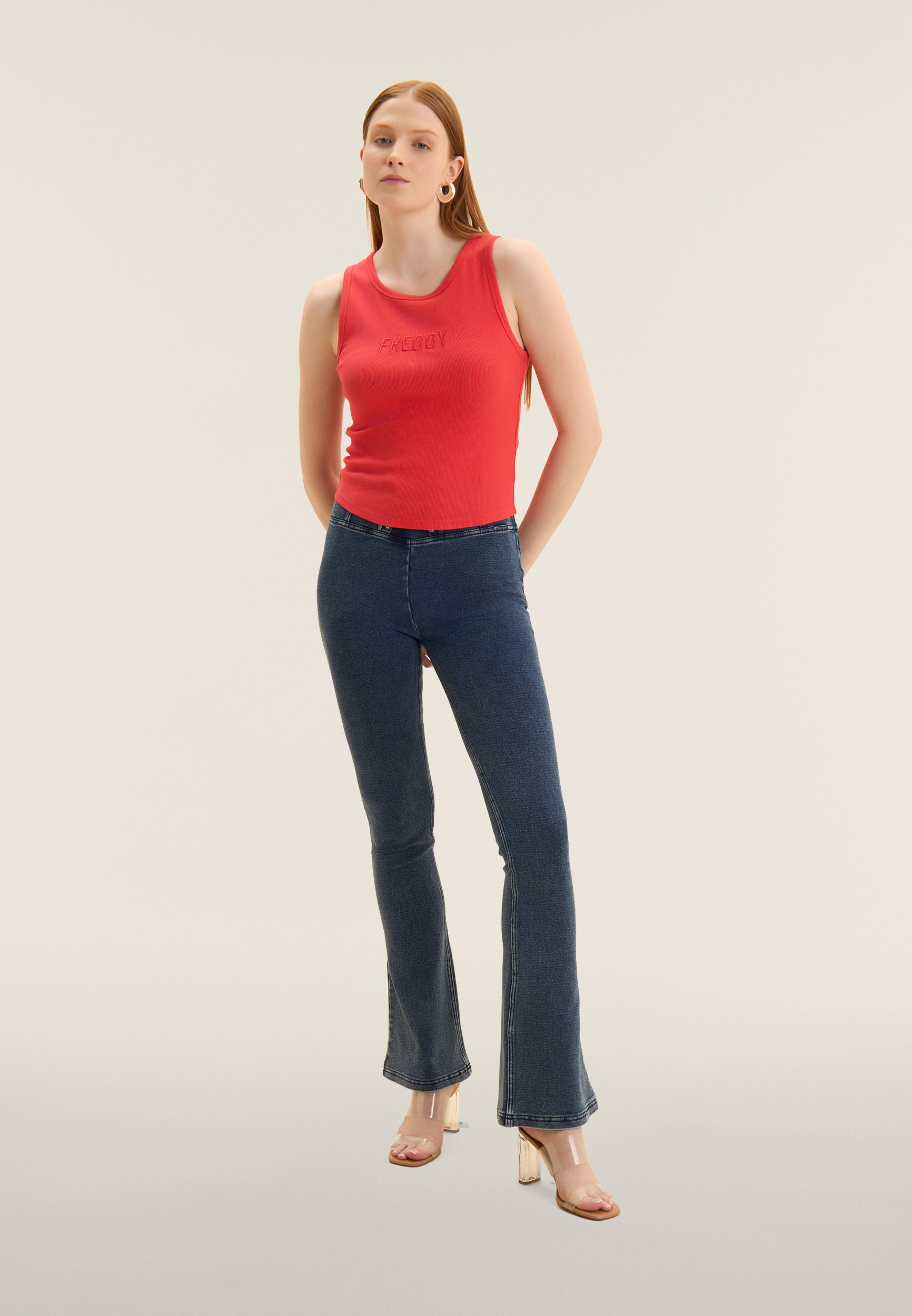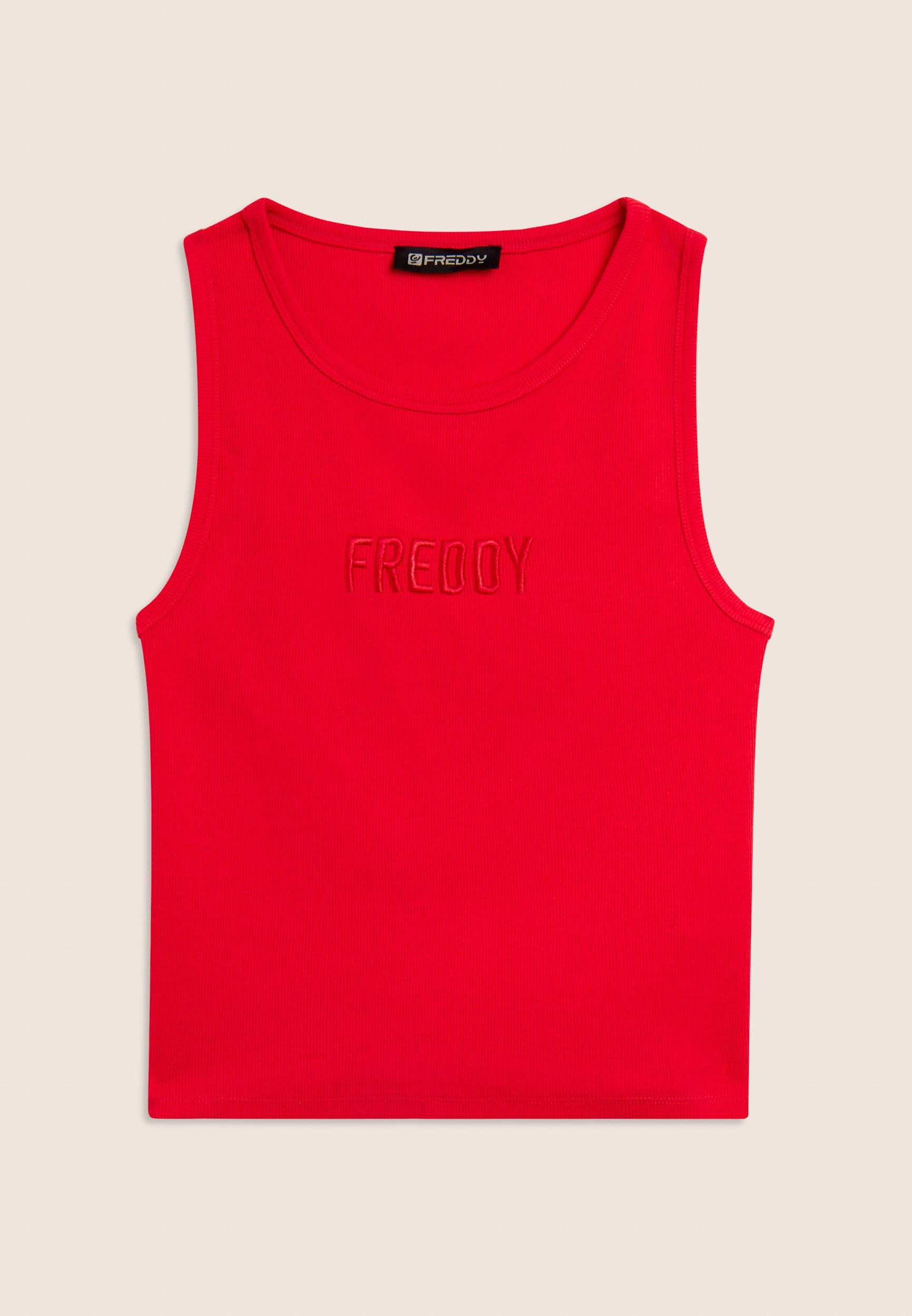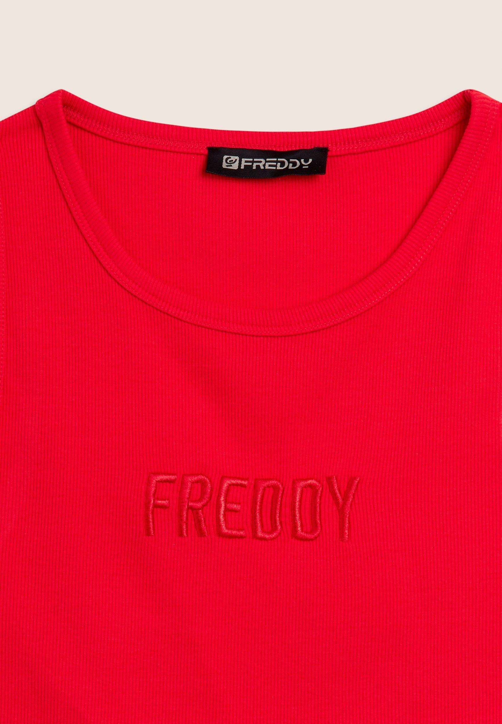 Close-fitting cropped tank top in stretch ribbed cotton, treated with enzymes for optimal colour movement and long-lasting softness. The round neck ad regular shoulder straps ensure a comfortable fit. The embroidered “FREDDY” logo on the front adds a distinctive and refined touch. A perfect garment for those seeking comfort and urban style, with a dynamic design inspired by street art.