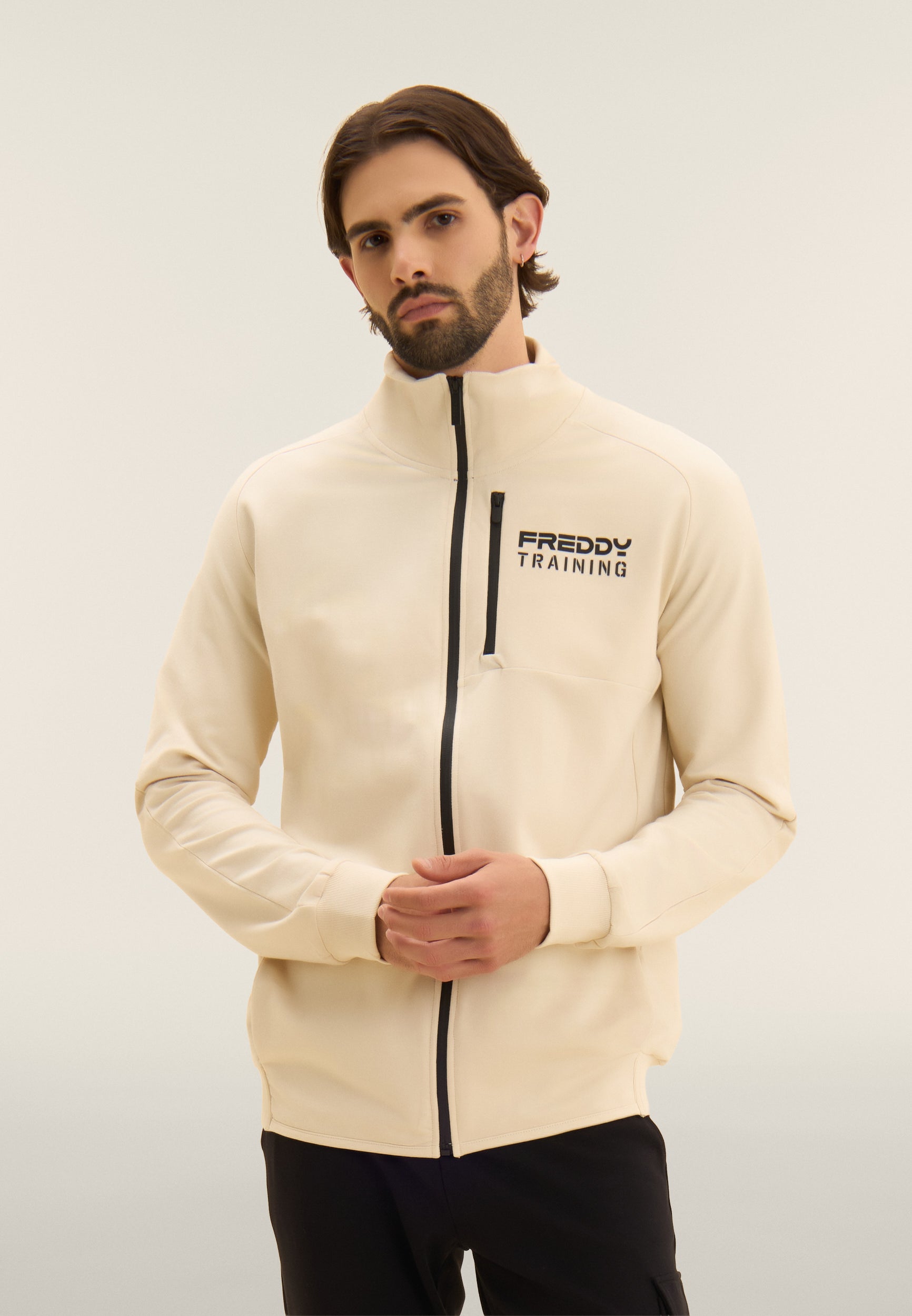 Regular-fit full-zip sweatshirt, perfect for outdoor activities and leisure time. It features a high neck with a ribbed interior, a straight front hem and a ribbed band at the back for a balanced fit. Long sleeves with ribbed cuffs ensure comfortable movement. The innovatively designed shoulder seams provide a dynamic touch. The rubberised 'FREDDY TRAINING' print on the heart adds personality to the garment. The front besom pockets are positioned along the seams for aesthetic cleanliness, and the zipped breast pocket offers extra practicality. Made of baby French Terry.