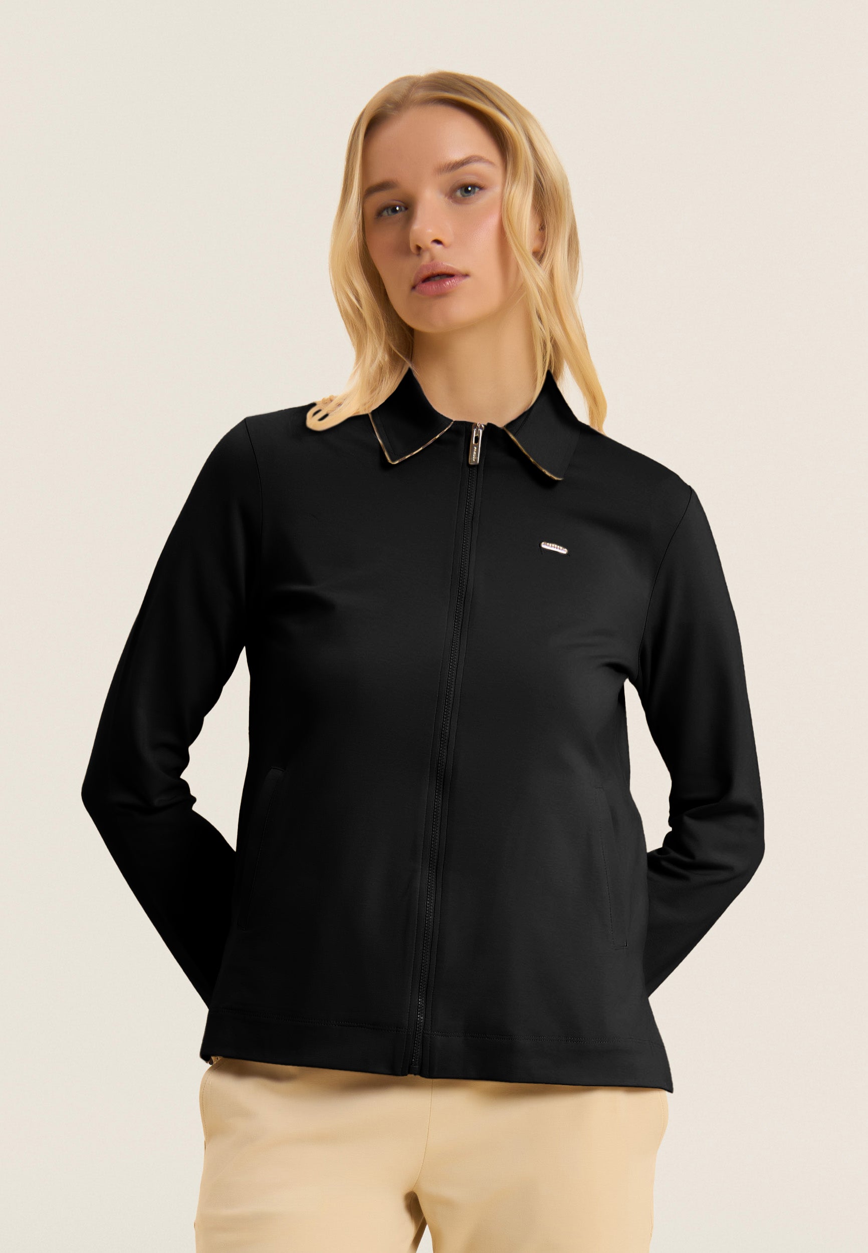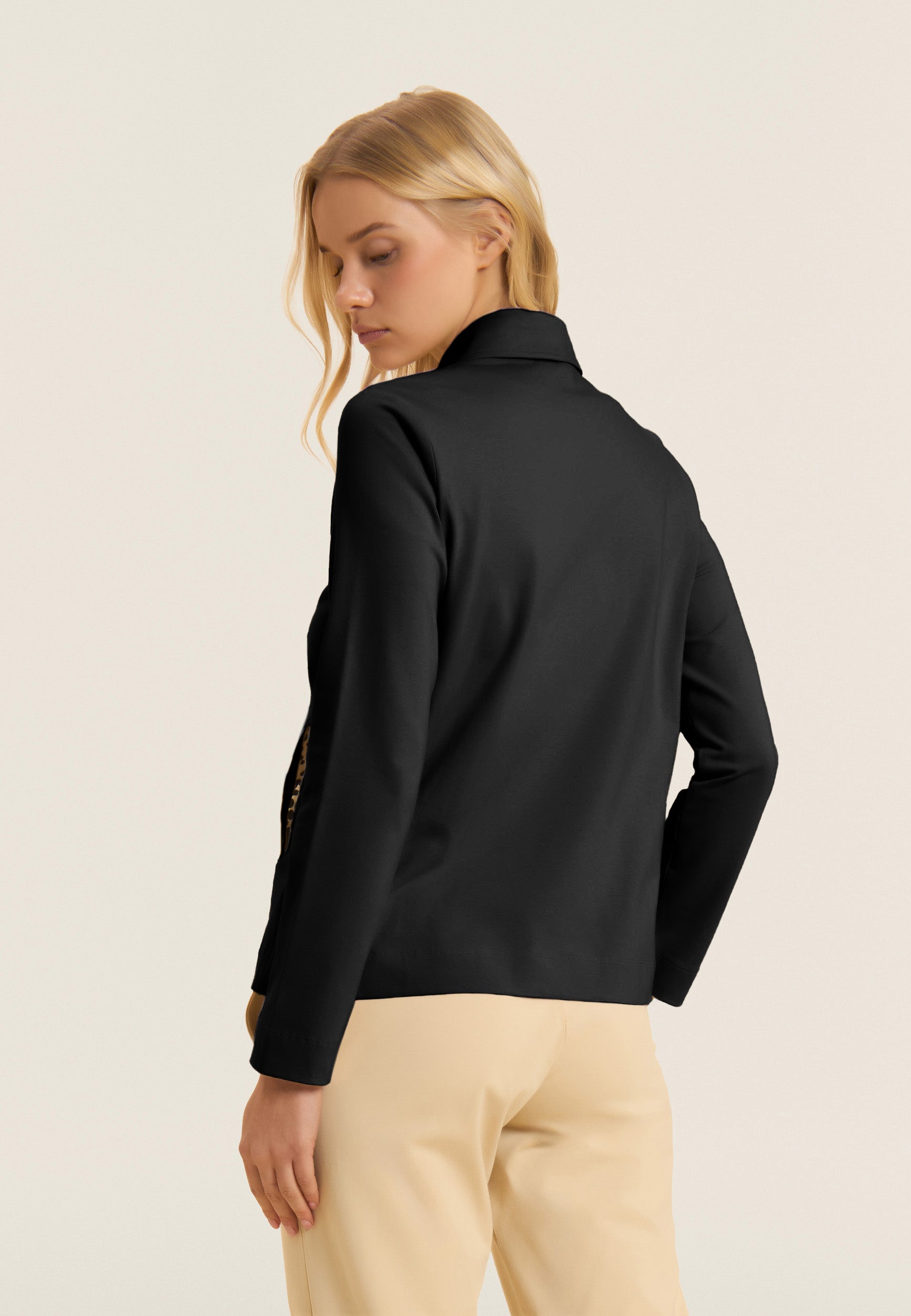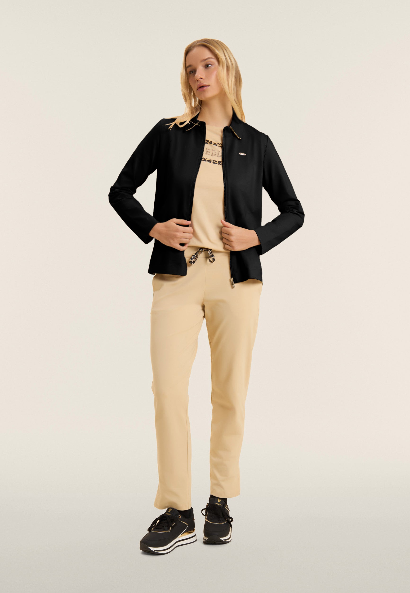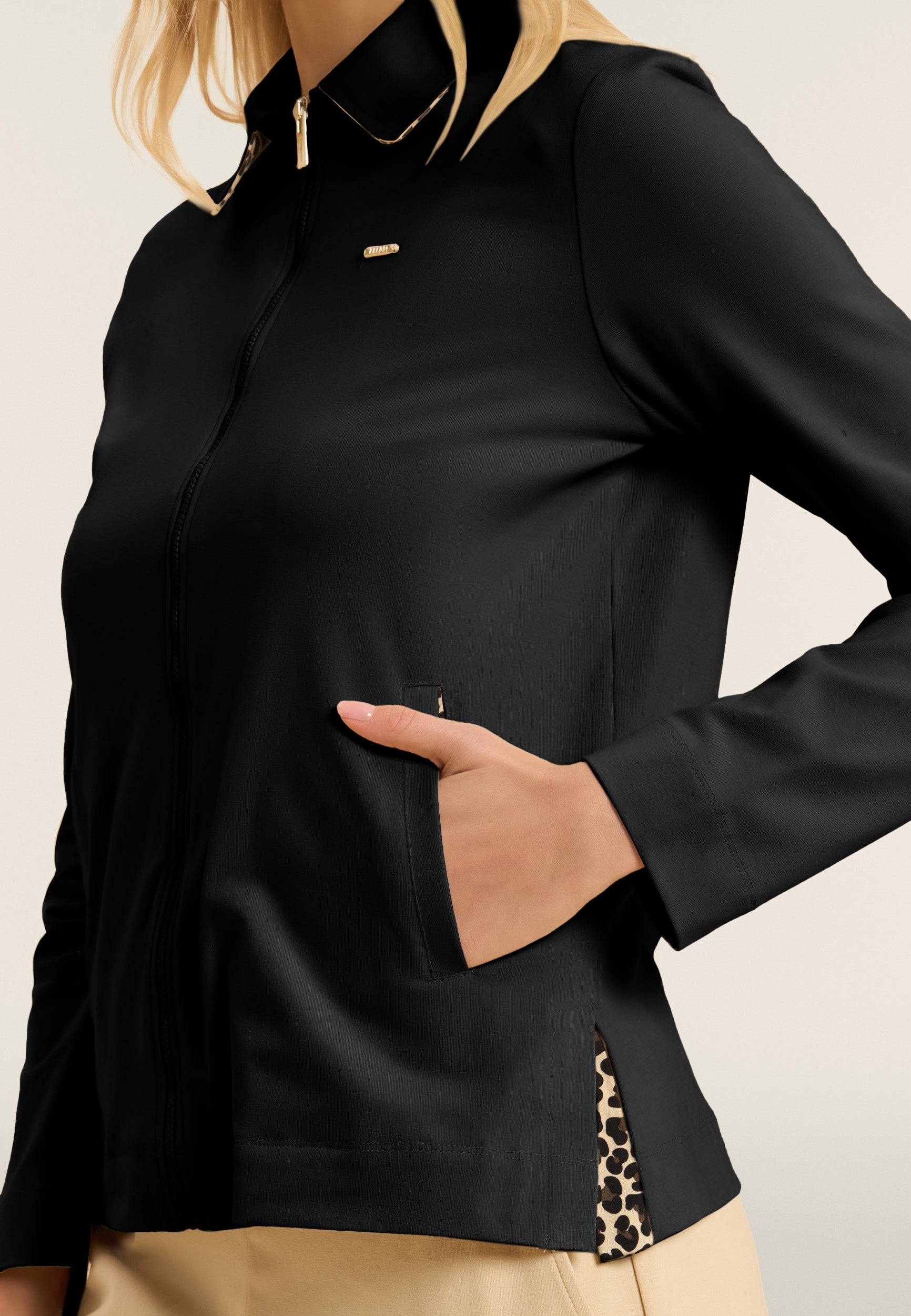 Zip sweatshirt with a regular fit and length, featuring a refined shirt collar with an animal patterned viscose bottom. Side openings at the bottom reveal a matching interior, adding a sophisticated detail. Besom pockets provide practicality and maintaining a clean and elegant line. Long sleeves without cuffs complete the essential design. The small studded Freddy logo on the heart and the golden FREDDY logo tab on the left pocket opening enrich the garment. Made of heavy cotton stretch jersey.