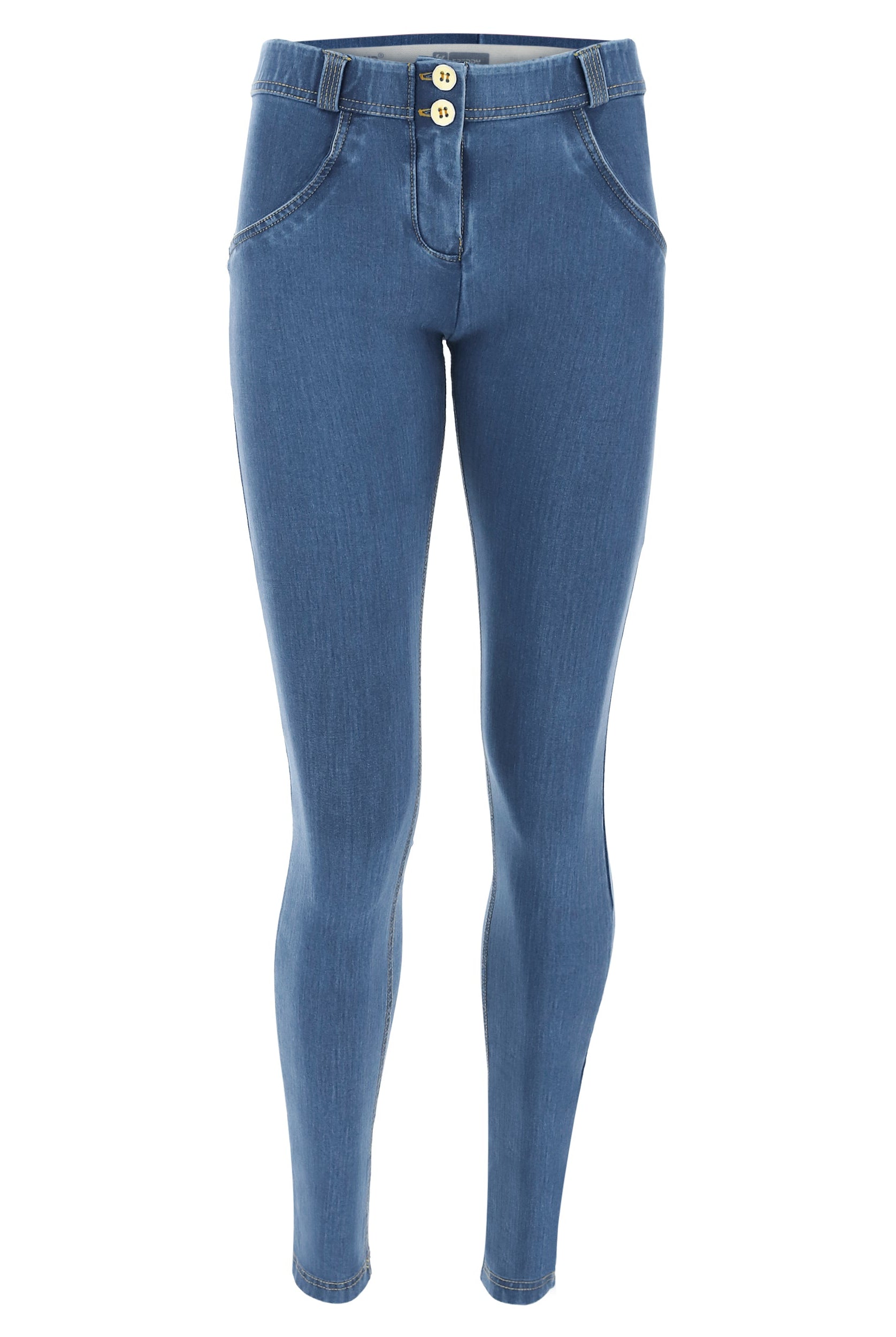 Die Mid-Waist-Modelle sitzen zwischen der Taille und dem Bauchnabel. Alle unsere mittlere Jeans haben vorne drei Freddy-typische Knöpfe. Sie sind etwas höher als unsere Regular-Waist-Hosen, aber nicht ganz so hoch, wie die High-Waist-Modelle. Sie haben einen bequemen, hohen Bund ohne Silikonstreifen, und die Knöpfe sorgen für einen perfekten Sitz. Jeans in Mid Waist eignen sich vor allem für kurvigere Frauen, die mehr Stütze und Form für den Bauch und die Taille möchten. Zusätzlich zaubern die Hosen natürlich den perfekten Po.