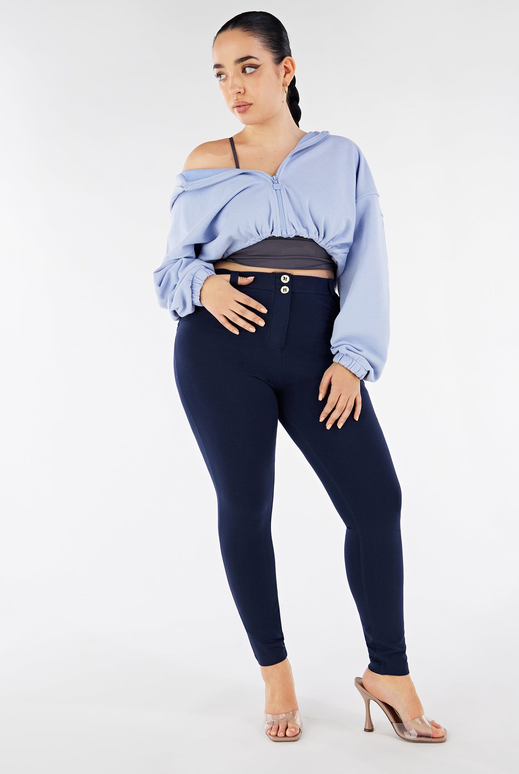 Die Mid-Waist-Modelle sitzen zwischen der Taille und dem Bauchnabel. Alle unsere mittlere Jeans haben vorne drei Freddy-typische Knöpfe. Sie sind etwas höher als unsere Regular-Waist-Hosen, aber nicht ganz so hoch, wie die High-Waist-Modelle. Sie haben einen bequemen, hohen Bund ohne Silikonstreifen, und die Knöpfe sorgen für einen perfekten Sitz. Jeans in Mid Waist eignen sich vor allem für kurvigere Frauen, die mehr Stütze und Form für den Bauch und die Taille möchten. Zusätzlich zaubern die Hosen natürlich den perfekten Po.