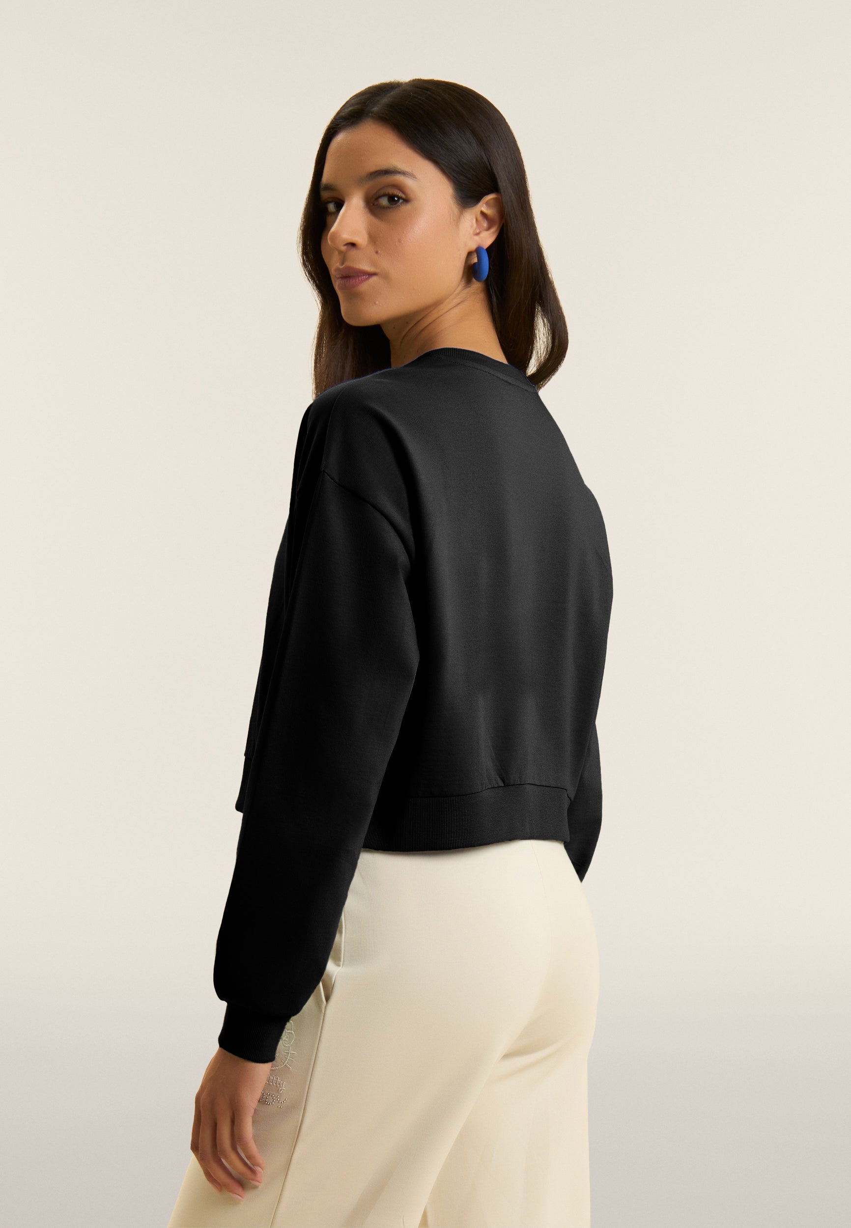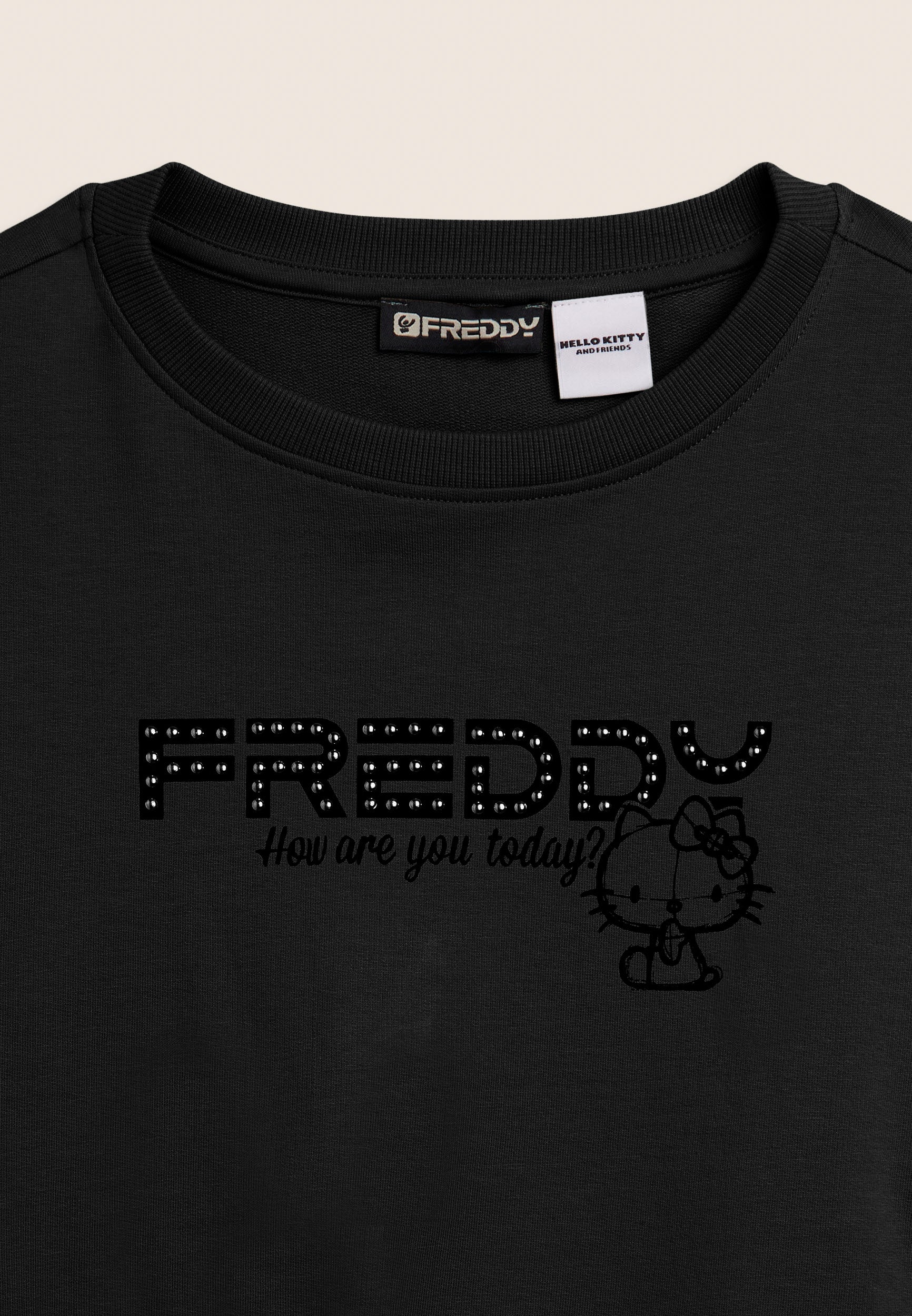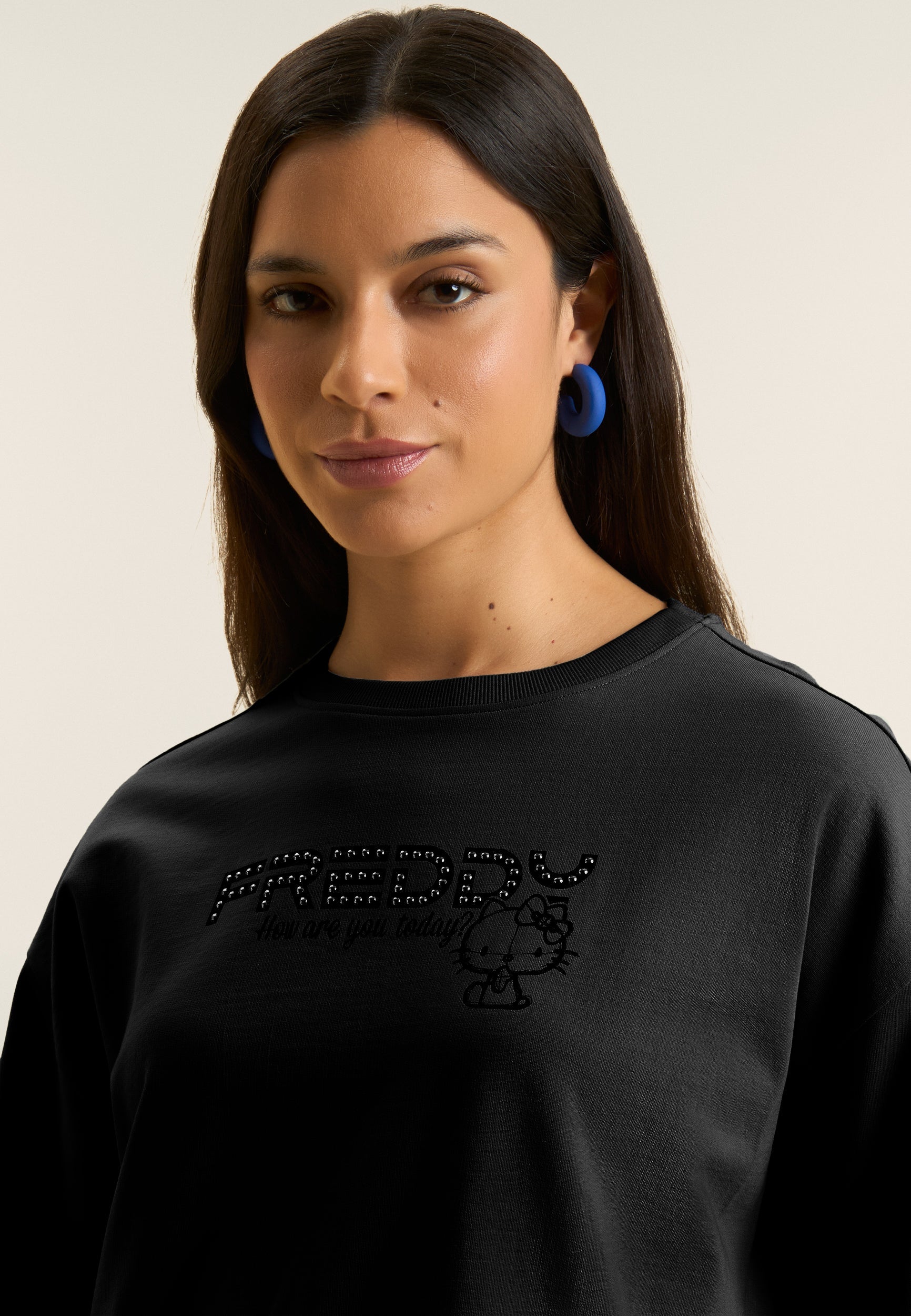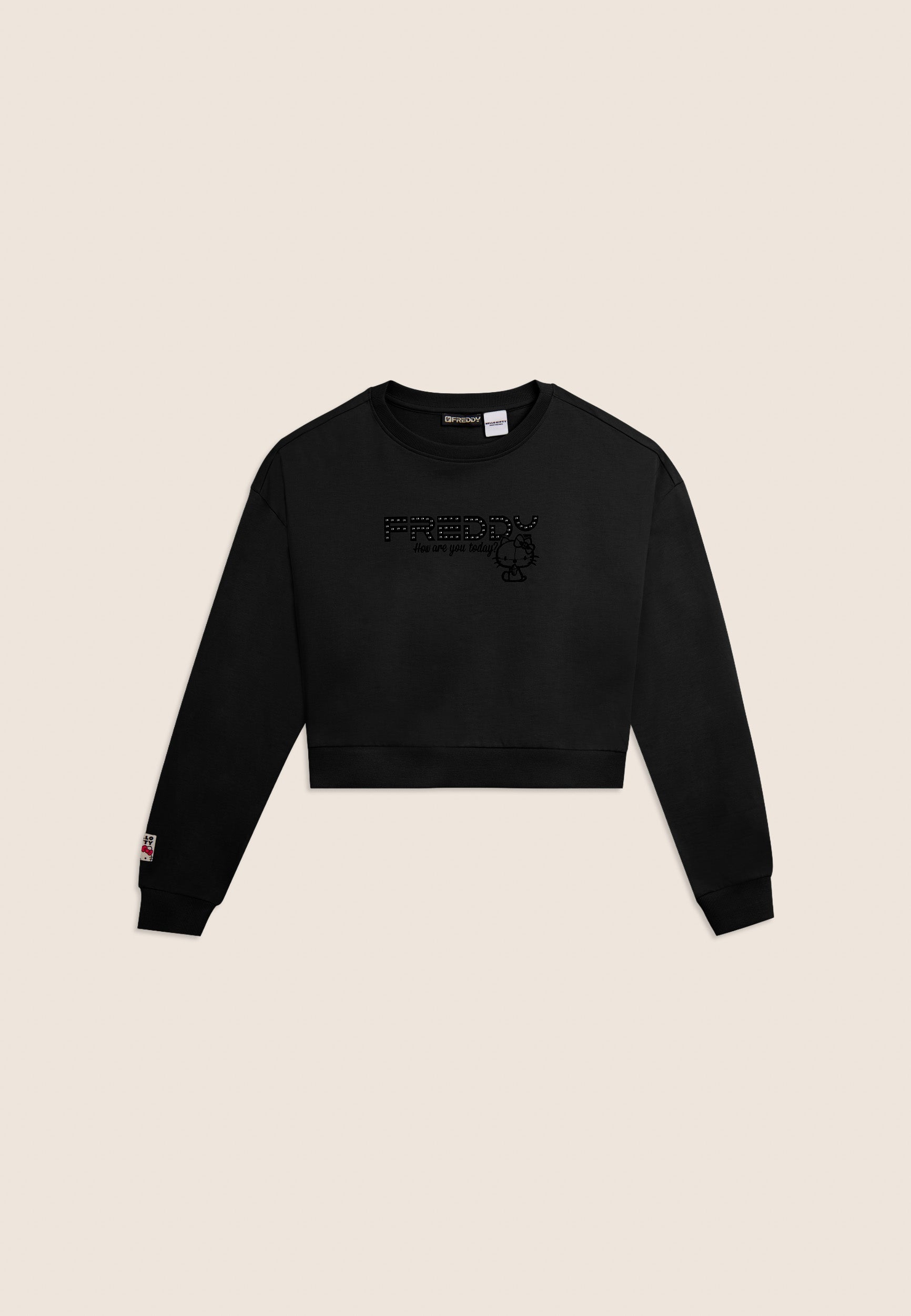 Comfort-fit sweatshirt with cropped length, perfect for urban spirit looks. Made of 100% cotton French terry, it features a crew neck and ribbed bottom, long sleeves with dropped shoulder and cuffs for a relaxed but neat fit. Hello Kitty and the lettering “How are you today” stand out on the front, accompanied by the FREDDY logo decorated with studs. A perfect mix of pop sweetness and metropolitan character.