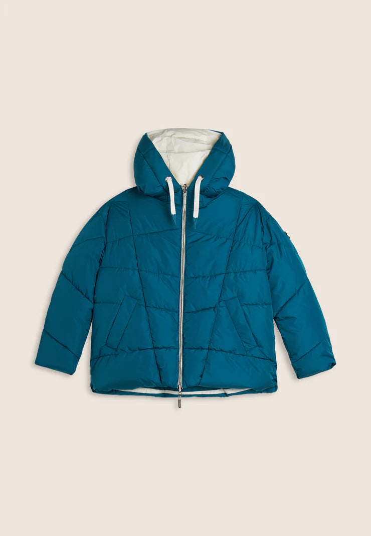 Reversible down jacket with comfort fit and hip length, ideal for creating different looks. Quilted with horizontal bands on one side and contrasting details on the other, it has animal-friendly fake-down padding to retain the heat, remaining lightweight even in wet weather. Full-zip fastening, adjustable drawstring hood and drawstring waist to adjust the fit. Front pockets with hidden snap fastening and rhinestone logo complete the versatile design.