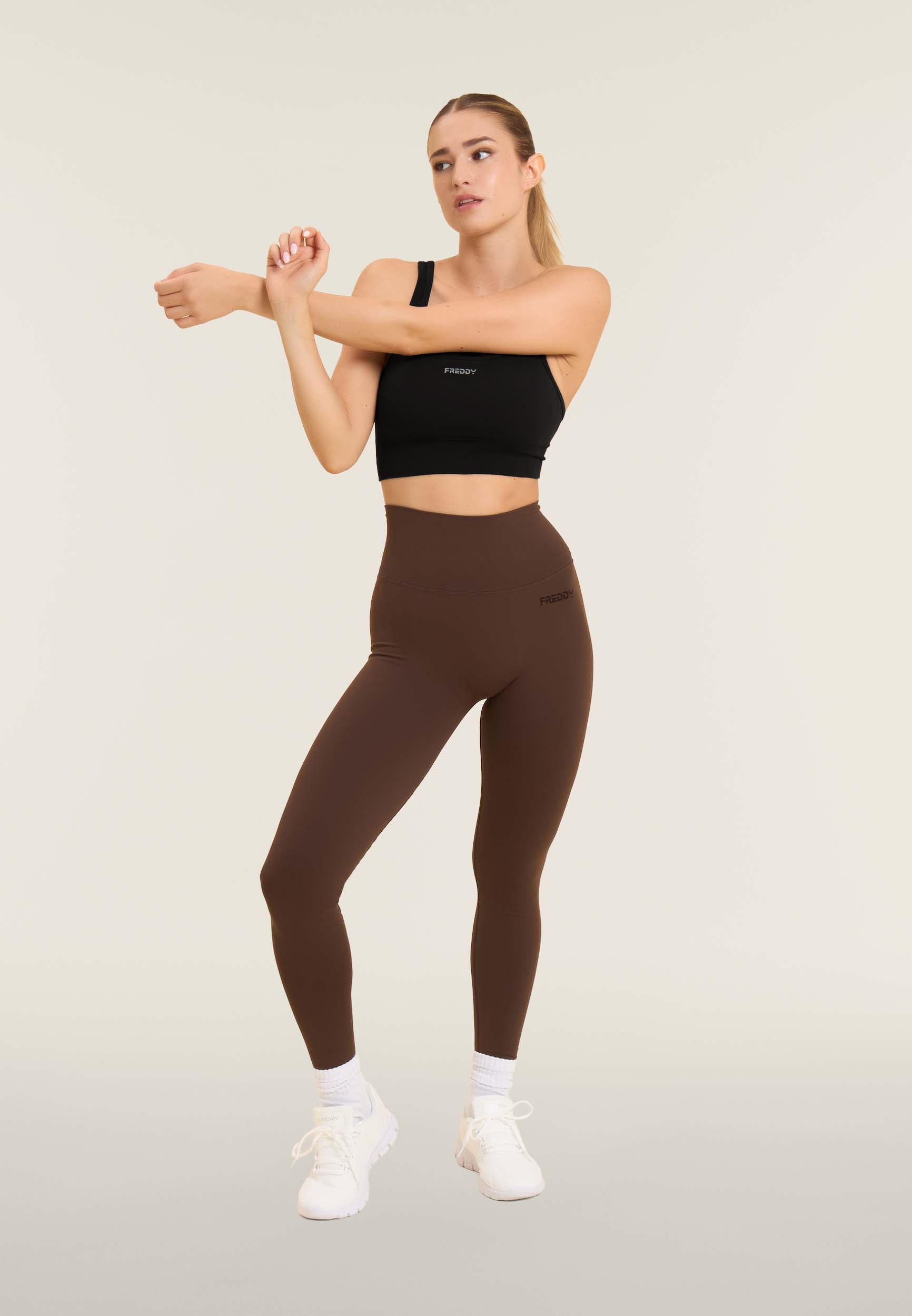 Medium support sports bra with removable moulded cups, ideal for daily training. The cut is designed to offer support and style: round neckline, regular shoulder straps crossed at the back, and side inserts in herringbone textured fabric. The nylon jersey fabric is breathable and durable.