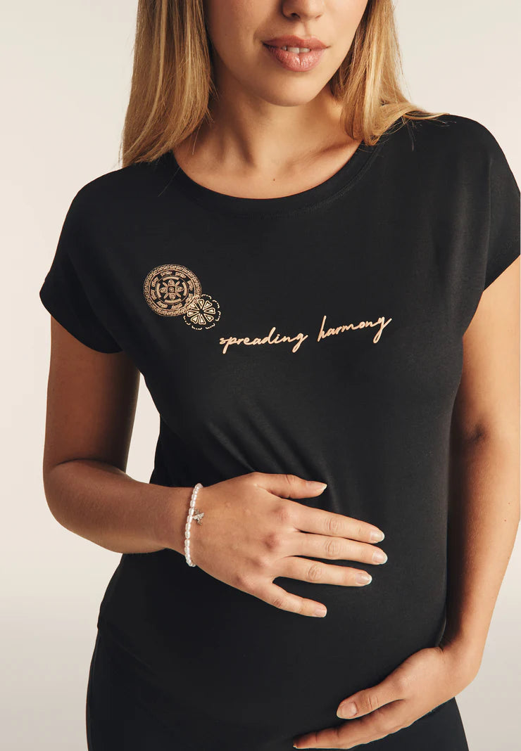 Comfort and style come together in this supima cotton jersey t-shirt, featuring a rounded hem and cap sleeves. The mandala-style graphic and central “Spreading Harmony” slogan make it ideal for those seeking a casual yet meaningful garment. You can choose which graphic to wear on the front or back for a personalised touch.
