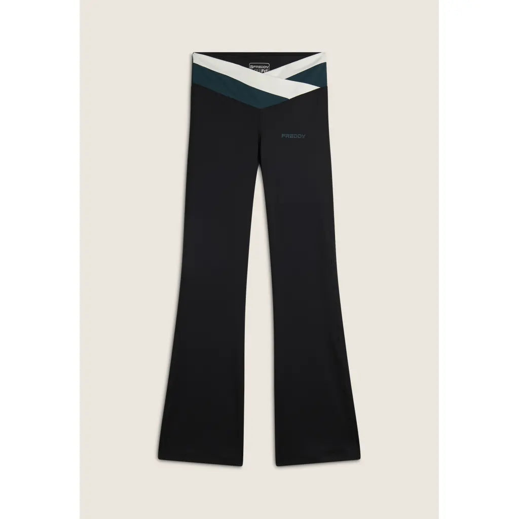 A touch of originality to your sportswear: these flare leggings are made of D.I.W.O. fabric with heavy stretch polyester, offering a perfect combination of breathability and durability. The two-tone crossed waistband adds a sophisticated detail that enhances the figure, while the glitter logo on the left front side adds a bright and elegant touch to your look.