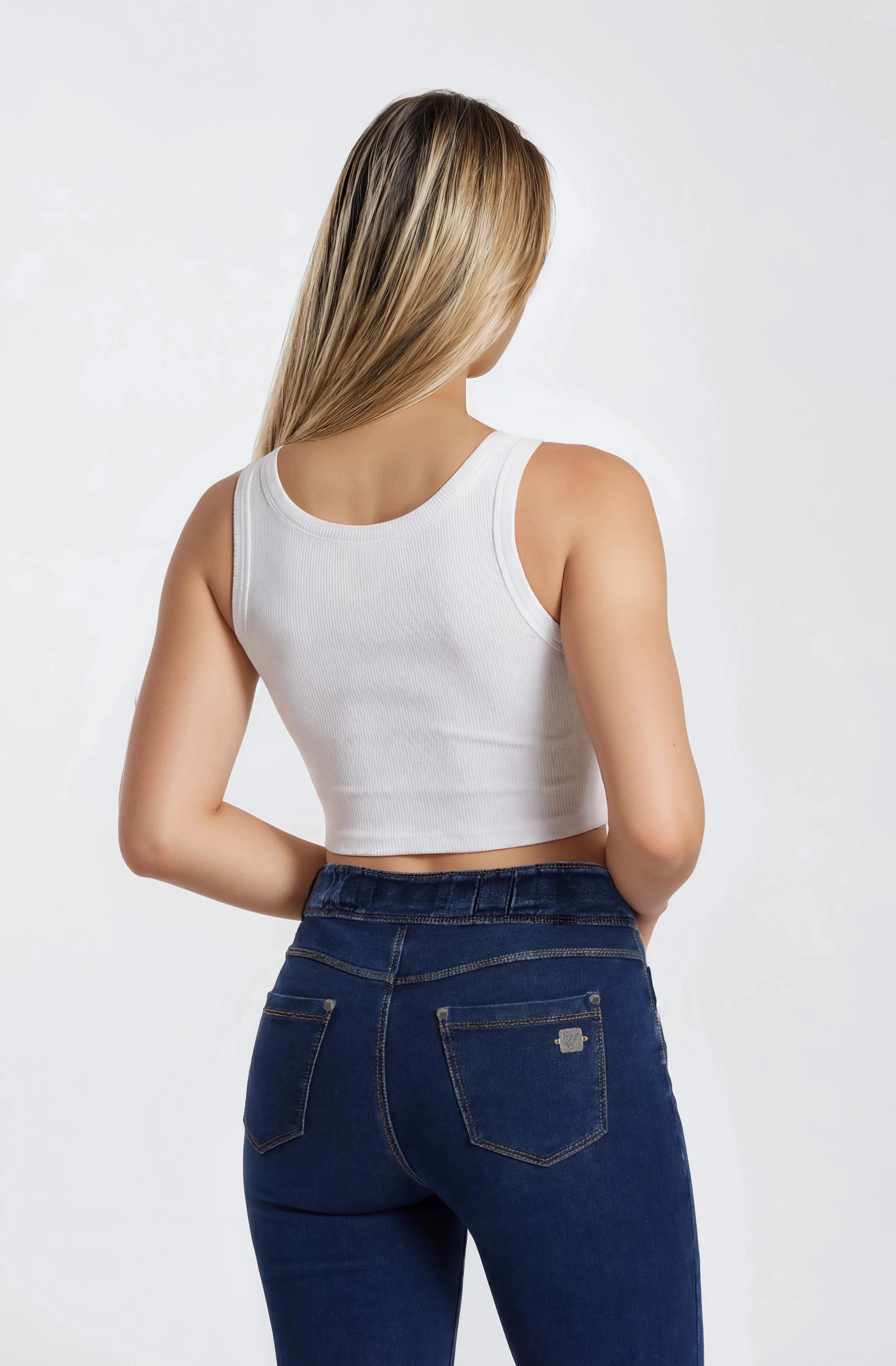 N.O.W. Comfort Mid Waist Skinny 7/8 Denim Jeans - Denim Dark Blue - Yellow Seam