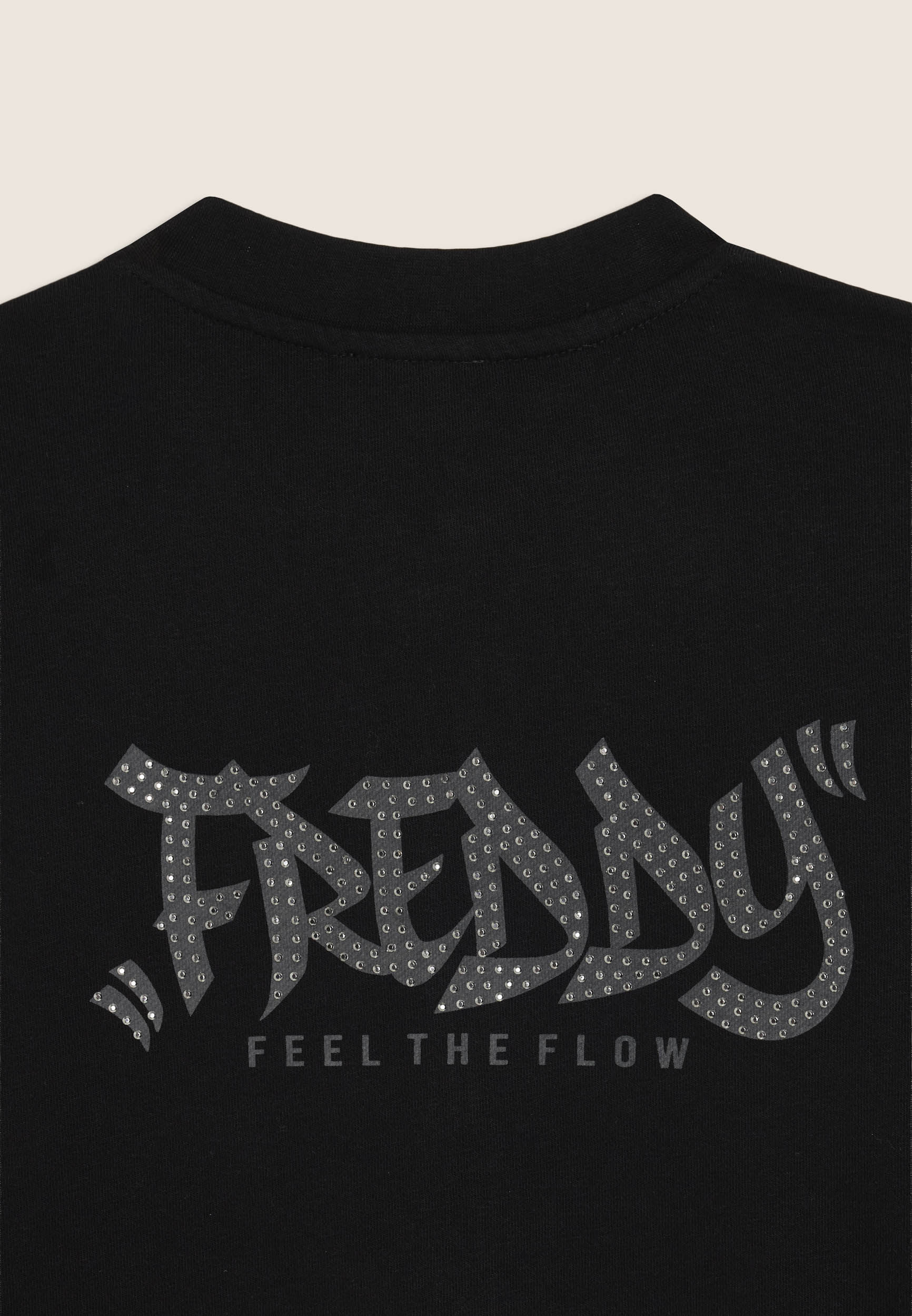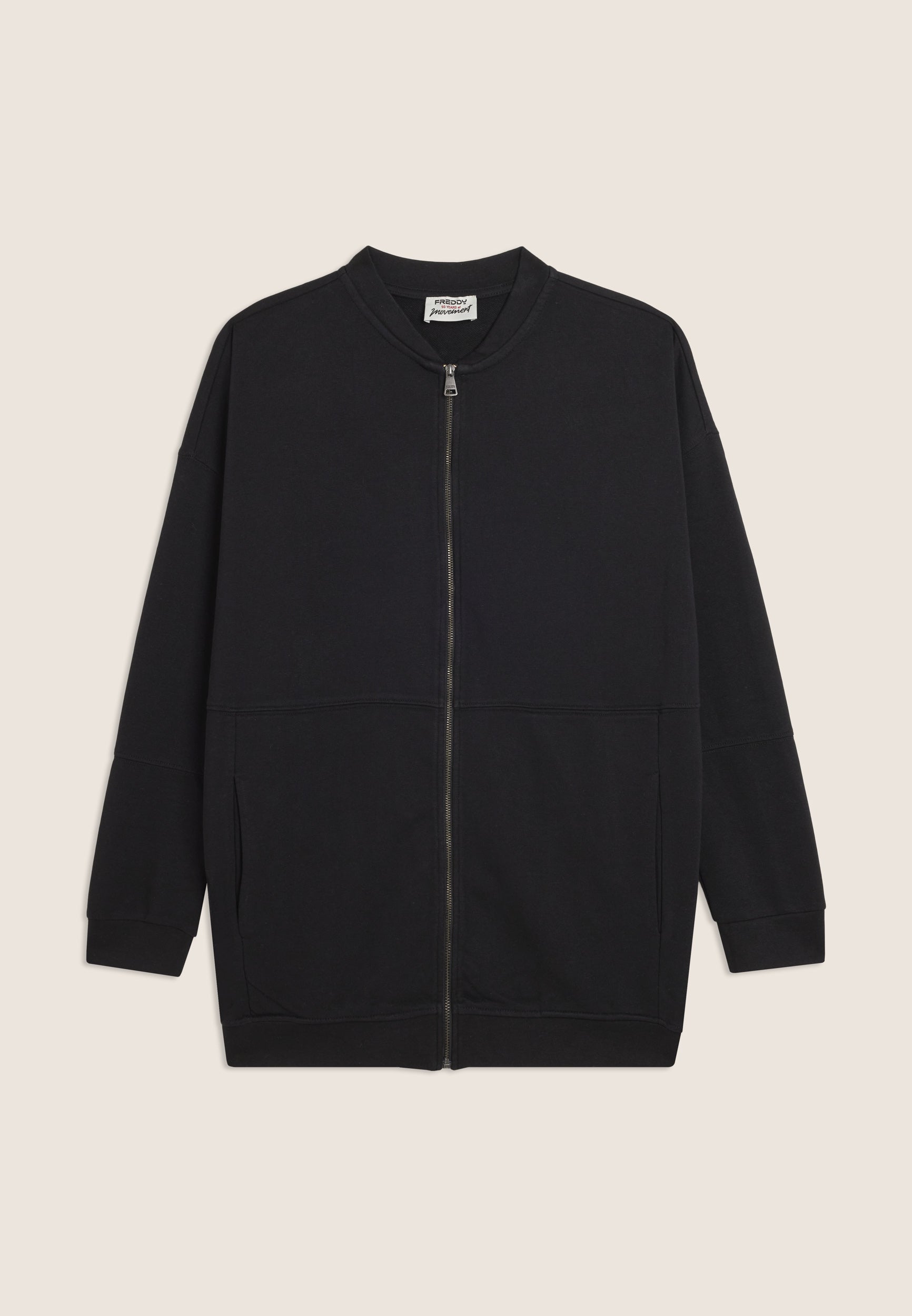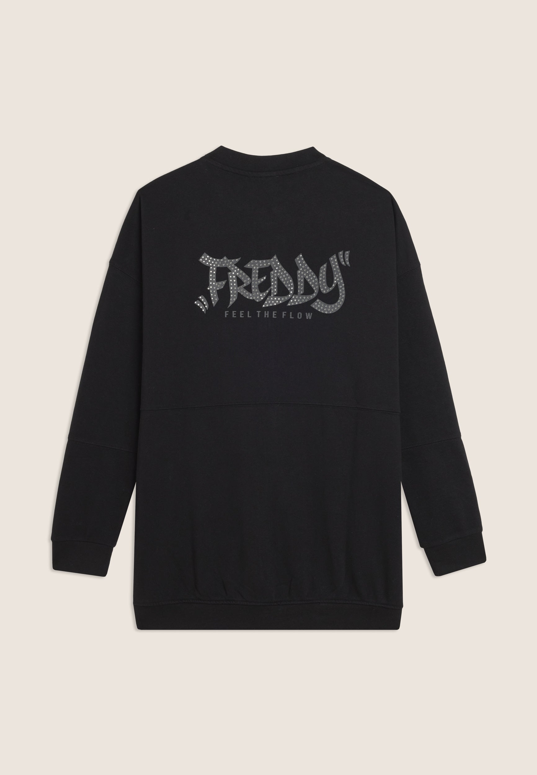 Oversize zip sweatshirt made of soft, enzyme-treated French terry fabric for comfort and durability. The under-the-hips length and ribbed hem provide a relaxed look, and the bomber-style ribbed neckline and ribbed cuffs on the sleeves add a dynamic touch. The large “FREDDY FEEL THE FLOW” print on the back, made in street art style and embellished with studs, is the heart of this garment, evoking the energy of break dancing and urban style. Besom pockets for extra convenience.