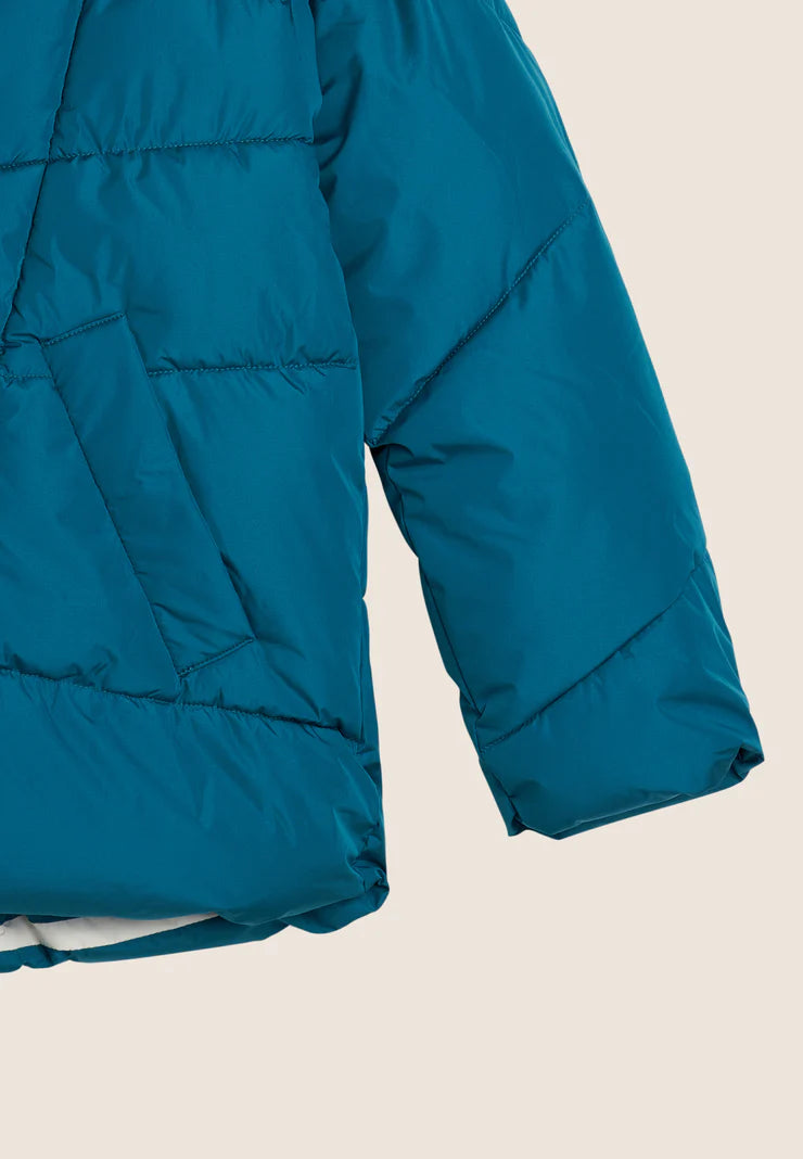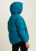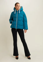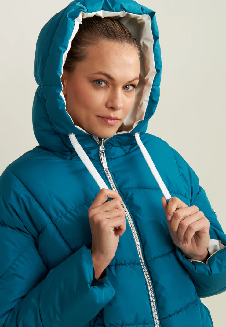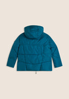 Reversible down jacket with comfort fit and hip length, ideal for creating different looks. Quilted with horizontal bands on one side and contrasting details on the other, it has animal-friendly fake-down padding to retain the heat, remaining lightweight even in wet weather. Full-zip fastening, adjustable drawstring hood and drawstring waist to adjust the fit. Front pockets with hidden snap fastening and rhinestone logo complete the versatile design.