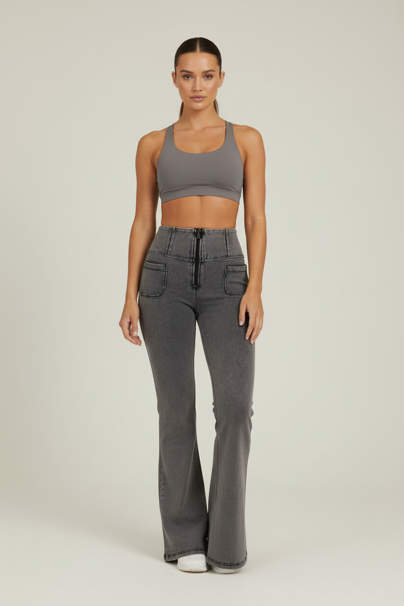 WR.UP® Bukser i grått: designet for å fremheve og bevege seg med deg. Dette plagget imponerer med en elegant vidde som visuelt forlenger bena. I tillegg kommer en tidløs full lengde, perfekt for alle årstider. Utseendet fullføres av en flatterende høy midje som gir mild støtte. Laget for å tilby det klassiske utseendet til denim med komforten av mykt, fleksibelt stoff. Som en del av WR.UP®-serien har de patentert teknologi designet for å naturlig forbedre og forme silhuetten din. Italiensk design som utstråler selvtillit og stil.