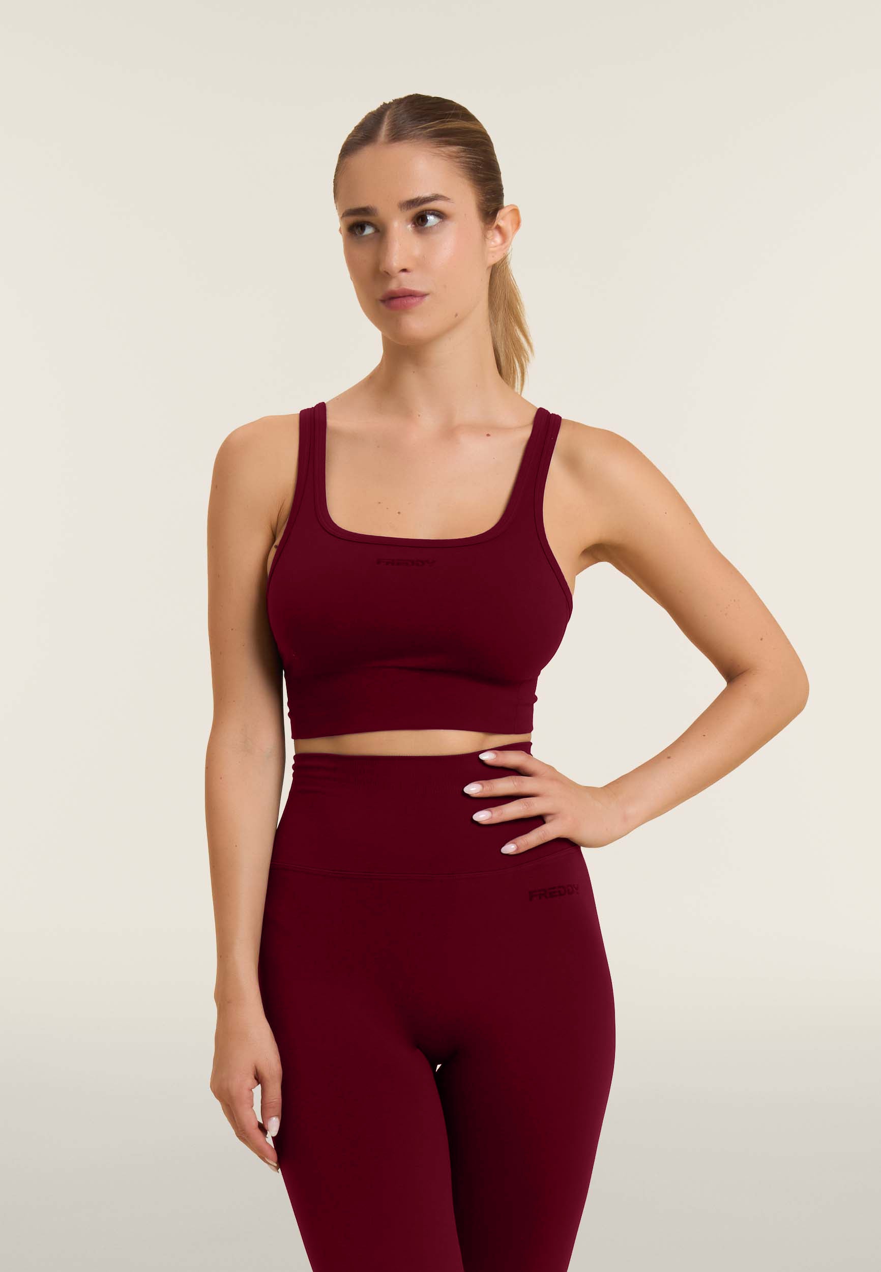 Medium support sports bra with removable moulded cups, ideal for daily training. The cut is designed to offer support and style: round neckline, regular shoulder straps crossed at the back, and side inserts in herringbone textured fabric. The nylon jersey fabric is breathable and durable.