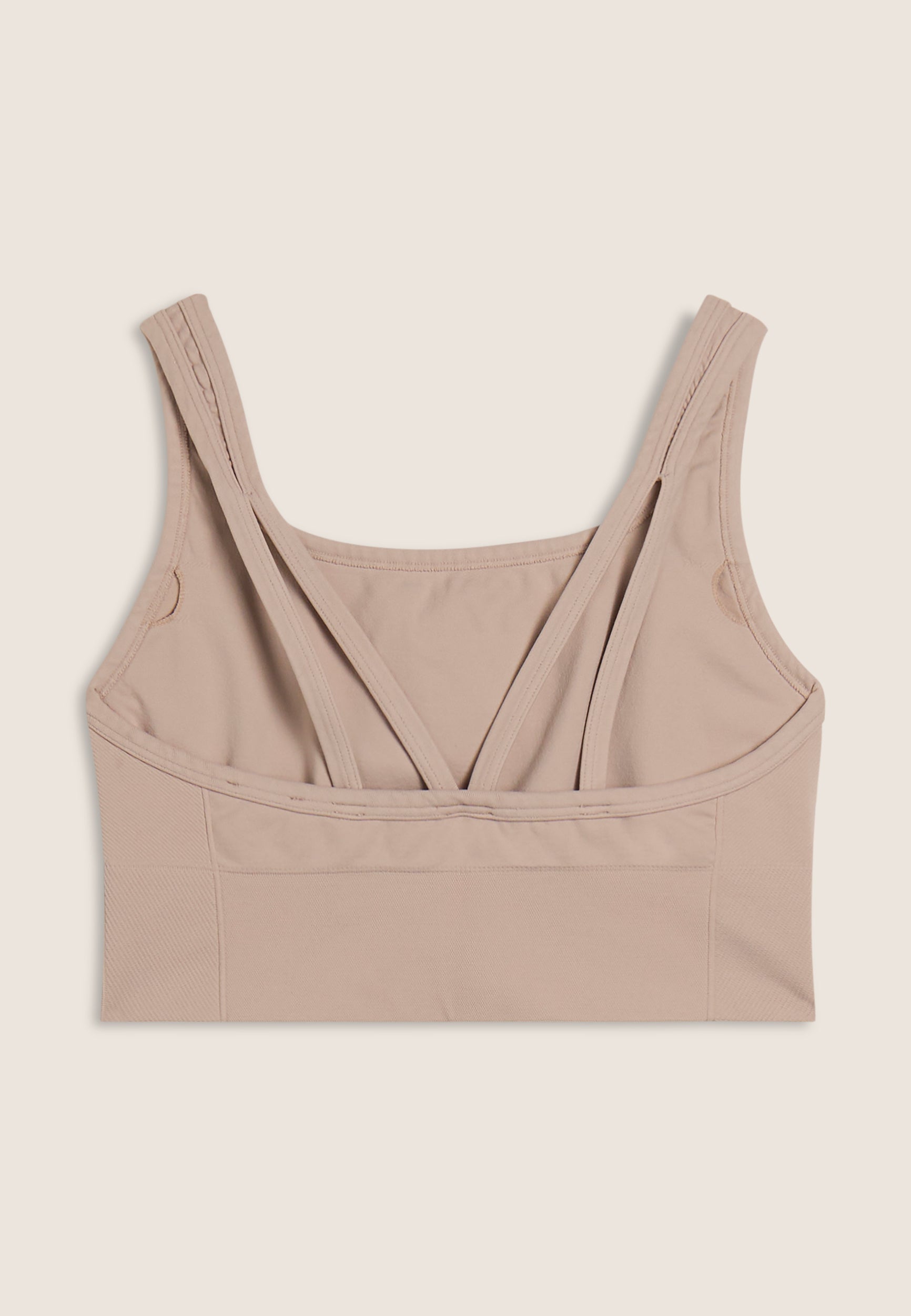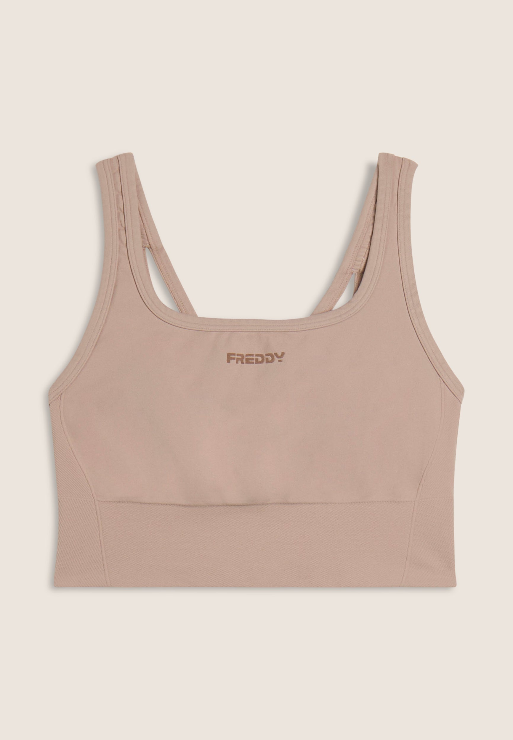 Medium support sports bra with removable moulded cups, ideal for daily training. The cut is designed to offer support and style: round neckline, regular shoulder straps crossed at the back, and side inserts in herringbone textured fabric. The nylon jersey fabric is breathable and durable.