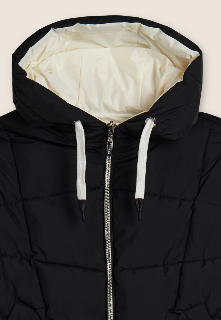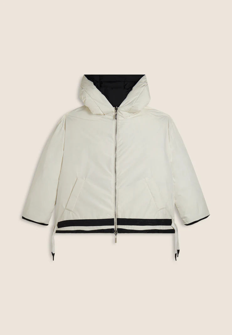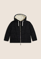 Reversible down jacket with comfort fit and hip length, ideal for creating different looks. Quilted with horizontal bands on one side and contrasting details on the other, it has animal-friendly fake-down padding to retain the heat, remaining lightweight even in wet weather. Full-zip fastening, adjustable drawstring hood and drawstring waist to adjust the fit. Front pockets with hidden snap fastening and rhinestone logo complete the versatile design.